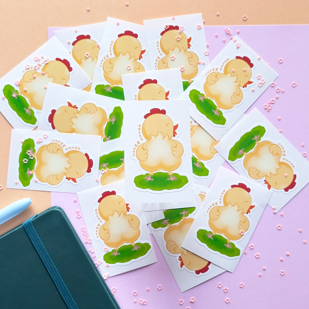 Add a dose of humor to your day with this adorable vinyl sticker featuring a cute chicken’s fluffy butt and the cheeky phrase “Guess what?” Perfect for laptops, water bottles, notebooks, or anywhere that needs a little giggle. Durable, water resistant, and made to last, this sticker is a fun conversation starter for chicken lovers and pun fans alike!